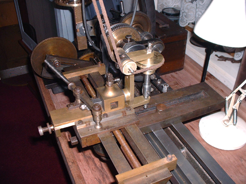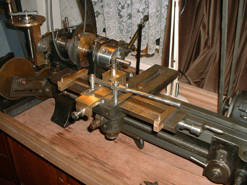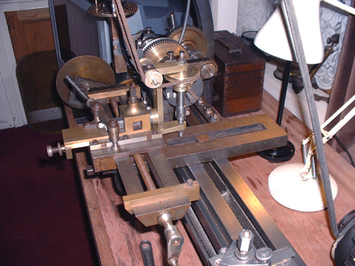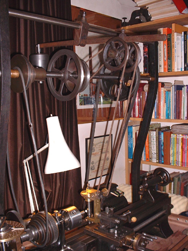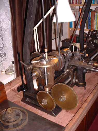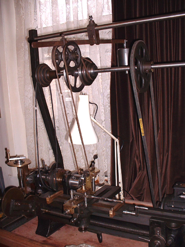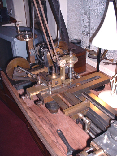 Here's the slide rest all cleaned up with the cutting frame in place and the overhead drive connected up. Notice that the overhead drive has grown another 3 step pulley on the flyshaft so I now have 4 speeds on it. I think you can probably see that if there was a wood or ivory workpiece in the lathe you could cut any shaped groove you wanted and at any angle, even across the face. When I have made the worm for the tangential gear I shall be able to make any number of divisions, that is space any number of cuts. This is the essence of a lathe equipped for ornamental turning.