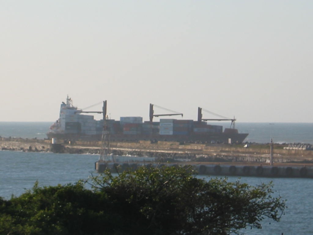 The SA Agulhas aground off the Western Breakwater at East London. The entrance channel is in the forground and is between the viewer and the short pier visible with its fixed beacon in the picture. In recent years several ships have been stranded in this position - all of them still there. The Agulhas would seem to be the latest victim of the unmanned engine room scenario so many ships now operate under. Minimal manning means that the engine room is frequently not manned at all once the engines have been started and run up to operating temperature. This, in turn, means that the "running maintenance" that used to be done by the oilers and greasers is also no longer carried out - and engine failure due to undetected minor problems suddenly becoming big ones is becoming a more frequent problem. When an engine fails and cannot be restarted in a position where the ship is close to the shore, the results can be very expensive indeed.