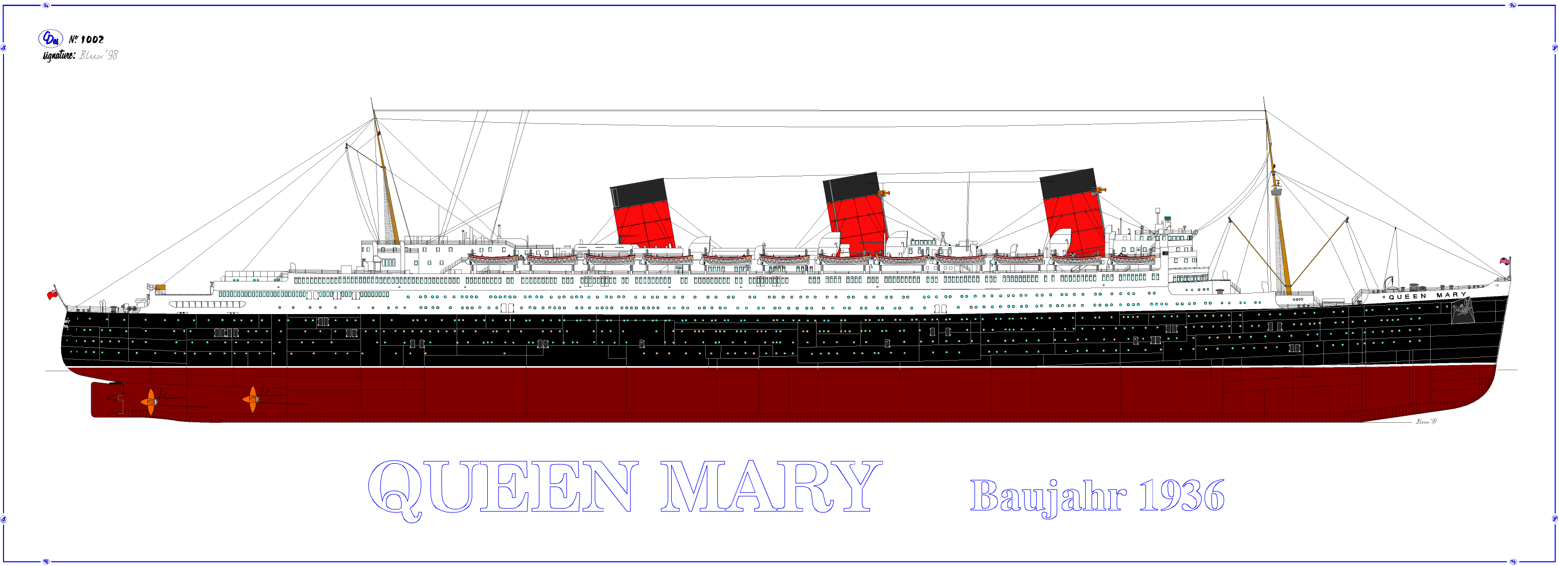 The Queen Mary. Her keel was laid down on the 31. 01. 1931. at John Browns yard on the Clyde, work was suspended due to economic troubles and it was not until 1934 that work was resumed, she was finally handed over to "Cunard" on 11. 05. 1936. She began her war work in 1940 and during this time she travelled over 600,000 miles and carried nearly 800,000 people, amongst whom were German POWs, GI, War Brides and a great many Australian and American Troops. There is a lot more to this episode of course, but one notable and tragic event was her collision with her escort, HMS Curacoa with a loss of 329 of that ships company. She was sold to the Town of Long Beach in 1967 for the sum of £1,230,000, about the current cost of an appartment in Knightsbridge. She remains at Long Beach and is a Museum, Hotel and Conference Centre.