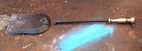 It was a bucket full of nuts and washers waiting to be sorted out. That's done and it no longer sits there like a permanent reproach. Good thing about small spaces crammed with tackle is that you are forced to be tidy. Latest job to come in is BK's fire shovel from his fireside companion. I didn't realise that they were still popular. The connection between the handle and the showel itself was a piece of monkey metal and it's broken off. I shall hand forge a proper tang for it..........