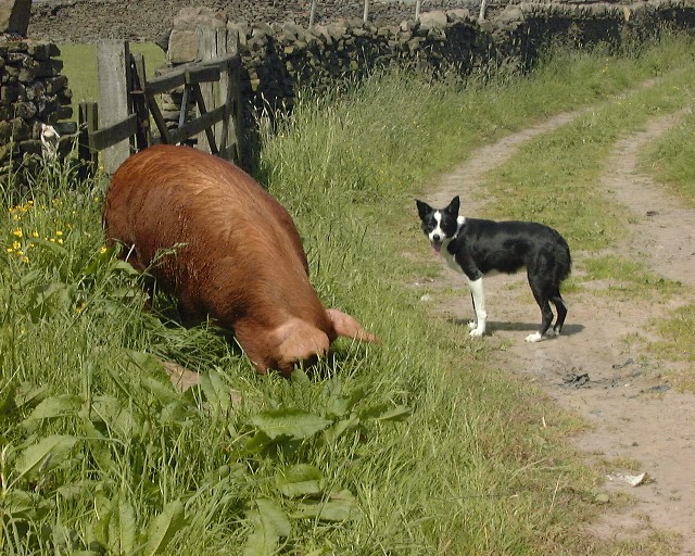Nell looking on has Gertie ( a Tamworth Pig) grabs a bite to eat