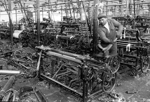 Demolition workers smashing up the weaving looms for scrap metal in Bancroft Mill Barnoldswick