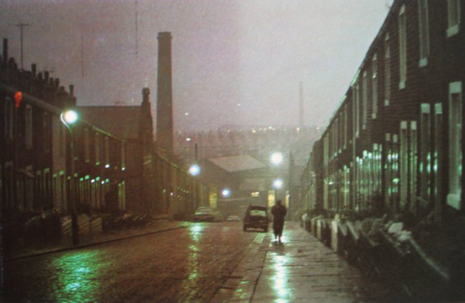 Looking down Messenger Street ? towards Valley Mills, Southfield Street, Nelson, in the 1960s/70s. Known as Jimmie Nelson's Mill, the chimney may have belonged to the Dublin Mill next door. At the bottom of the street were the notorious steps. |