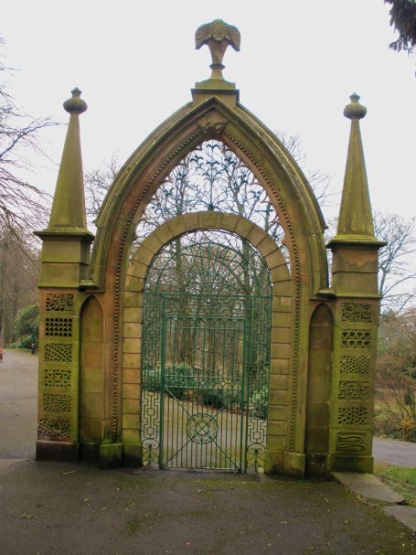The Wishing Gate in Marsden Park, Nelson, was originally called 'The Egyptian Gate' and was the entrance to the gardens of Marsden Hall. Children place rolled-up leaves in the carved holes and then stand in the gateway to make a wish. |