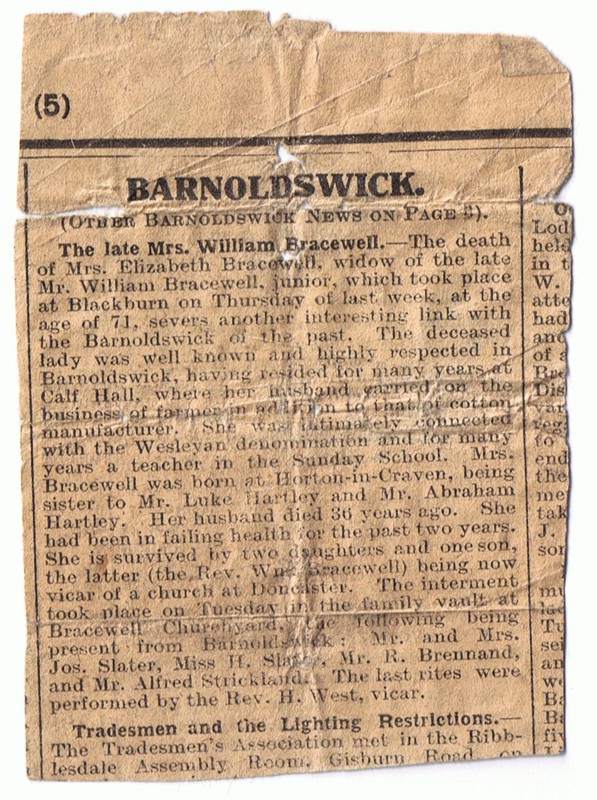 Newspaper cutting announcing the death of Elizabeth Bracewell and her internment at Bracewell Church |