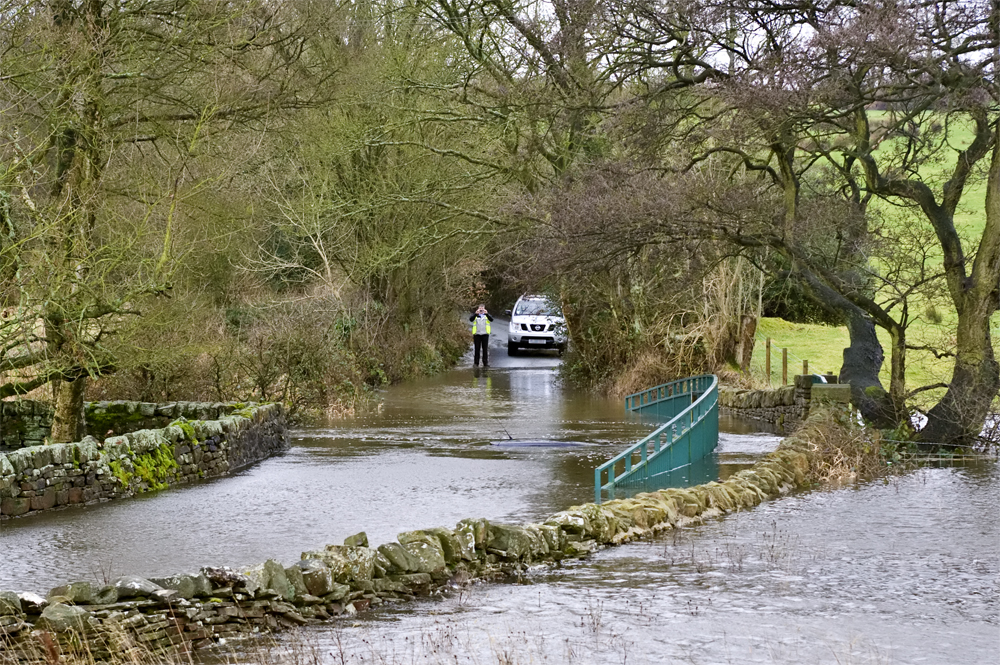 a pic of the flood at Reedymoor, Foulridge Res.(Burwain overflow), on Jan 21 2008. The policeman must imagine the teacher is still in the car.