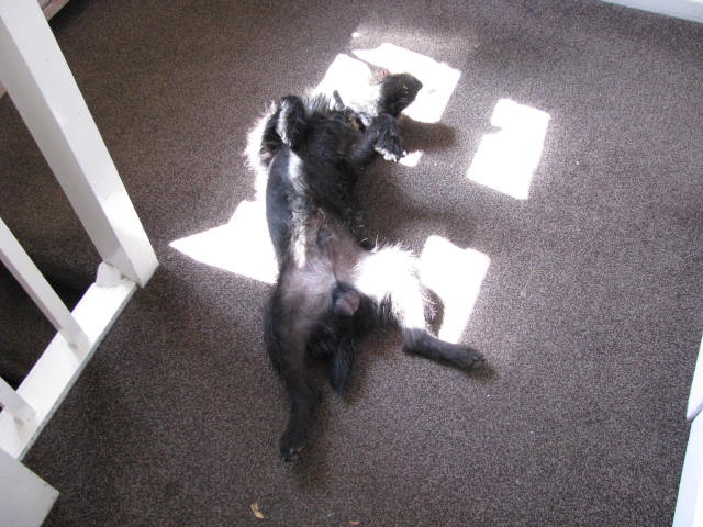 Typical dog, making sure his bits get warm. Mine's doing exactly the same at the moment.