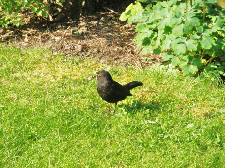 A nice colourful photo of our own resident blackbird that lives in the hedge of our front garden in Nelson. It is looking for worms and bits of bread etc. |