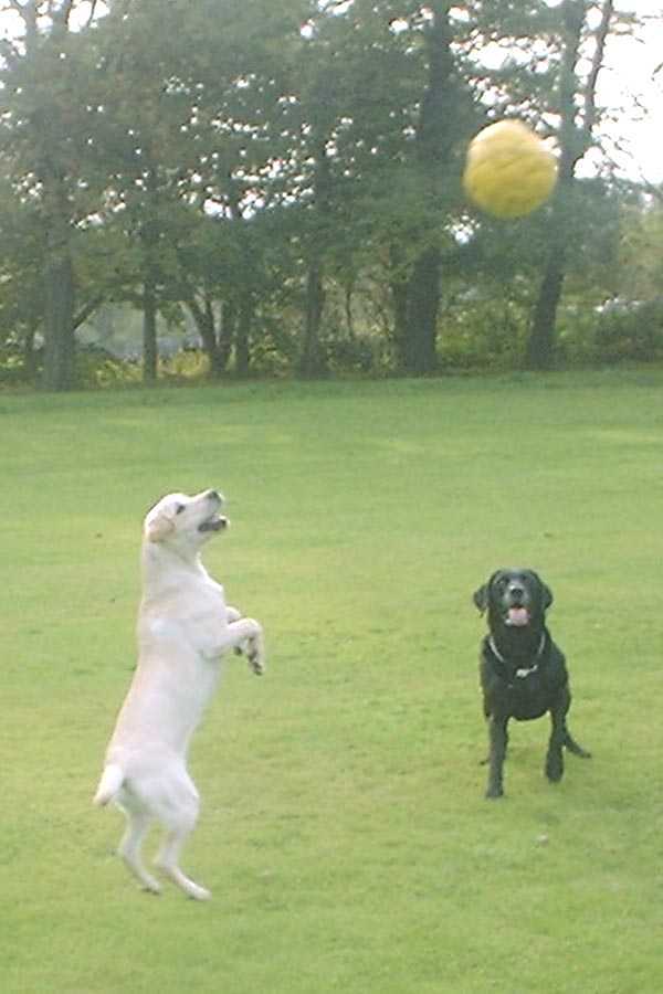 This is a picture of my dogs Bruno and Phoebe, they love playing football in the park!