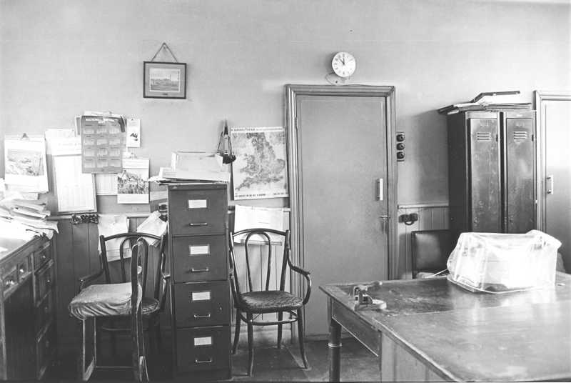 Part of the Cutlooker series of pics. This is the office at Bancroft in 1978. The desks are stand-up but high chairs have been made so the staff can sit at them.