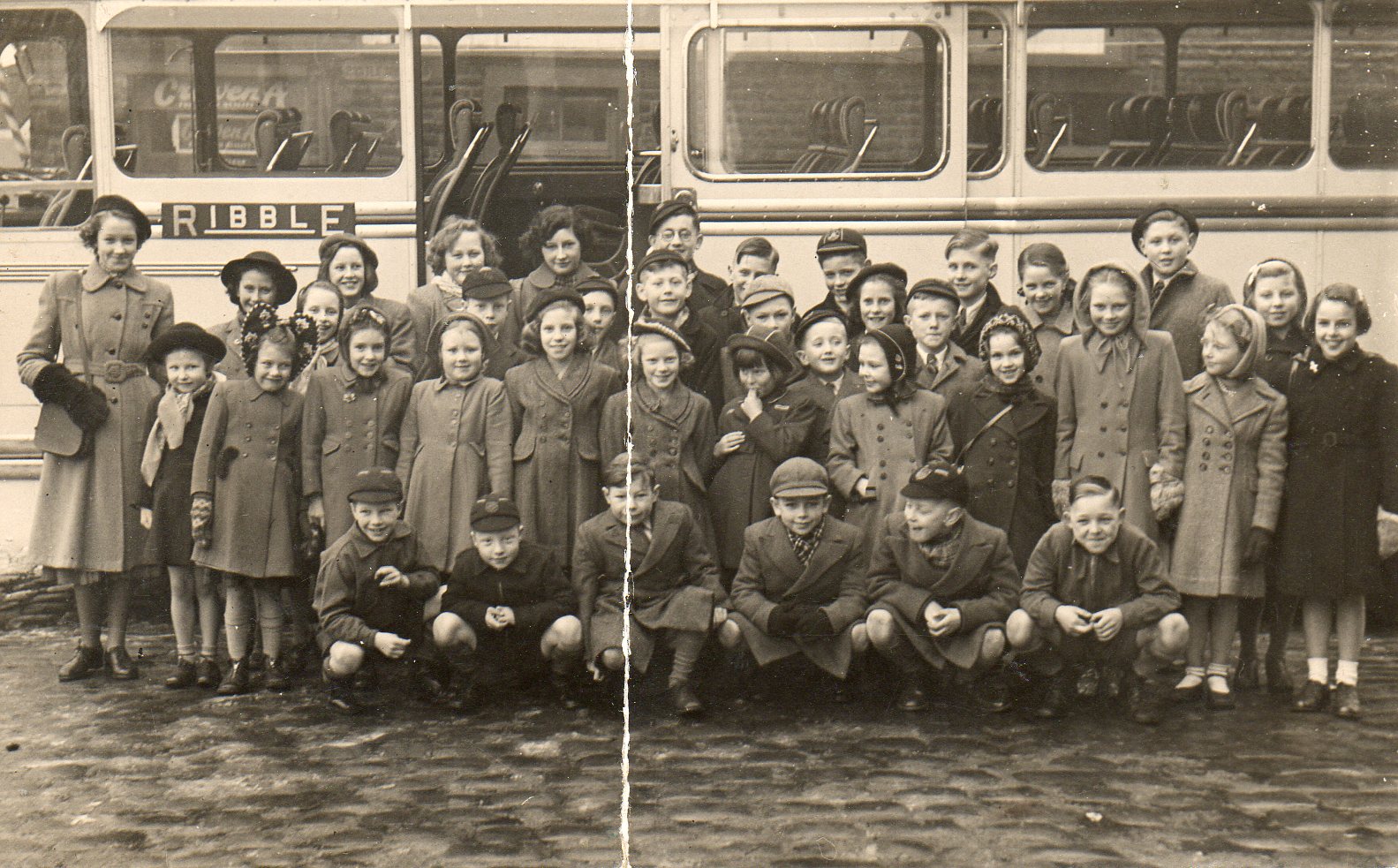 The dark haired girl at the back near the bus doorway is June Stubbs and 2 rows in front of her wearing a black beret looks like Alice Connor.