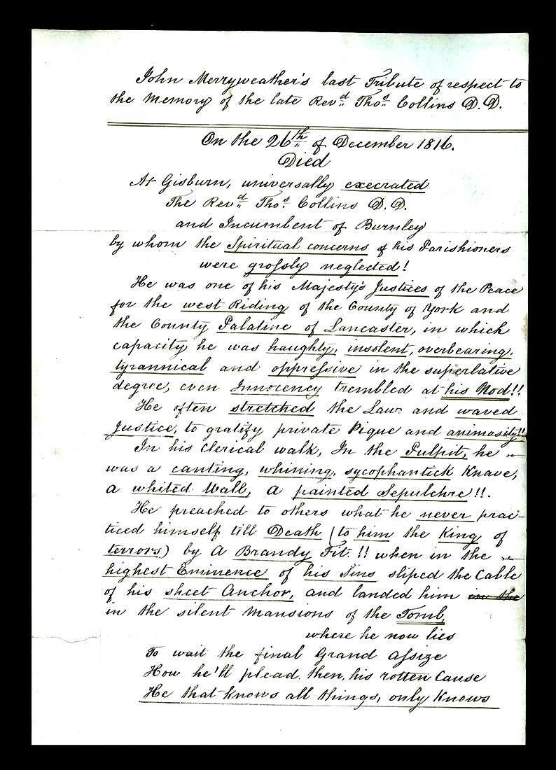 John Merriweathers last (acerbic) tribute to the Rev, Thomas Collins who died 26th, Dec. 1816, not much loved..