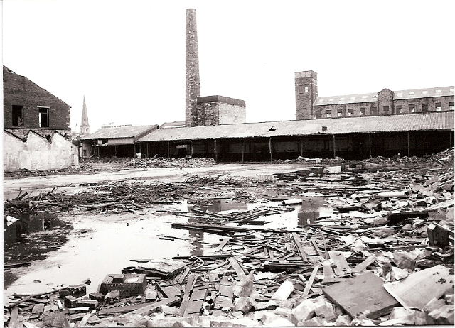 Taken from across the detritus-strewn flag stones where a number of weaving sheds had once stood, the tall stone chimney now bereft of its once distinctive oversiller thrusts skywards. |
