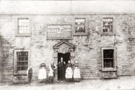 William Widdup( born 1844) outside the Anchor Inn doorway, with his wife, Elizabeth and staff. The small boy on the left is Ernest Jones Widdup born 1877..