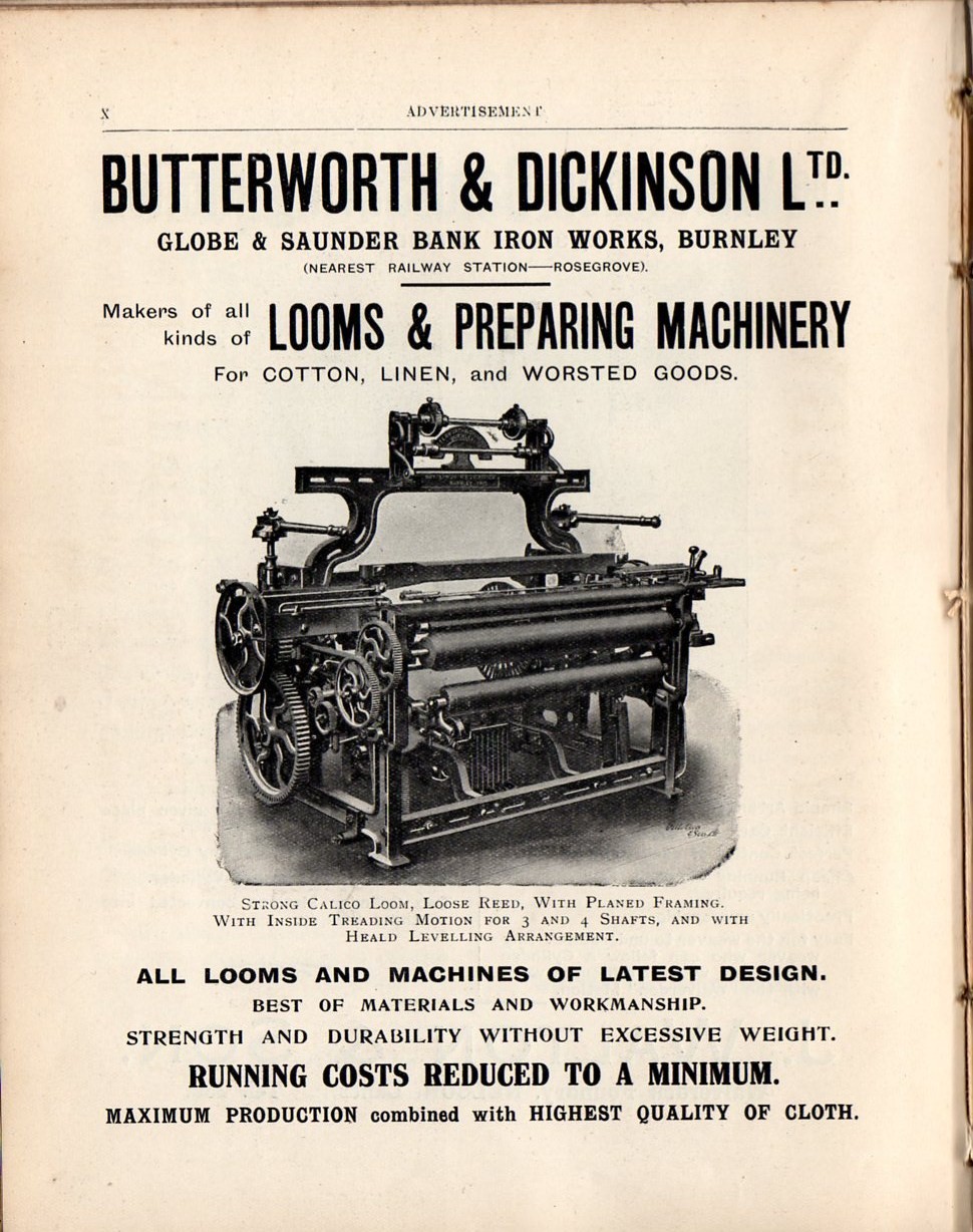 Butterworth & Dickinson Ltd, Globe & Saunder Bank Ironworks, Burnley. From "Practical Weaving vol 1: Shedding" by William Wilkinson pub 1915 Nelson |