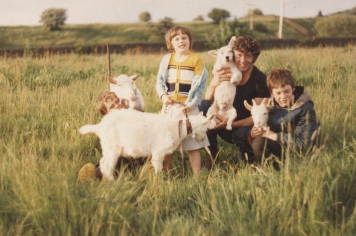 Our goat Nancy with her kids,and me and my kids and nipper our dog,jack cross corgi.thirty odd years ago, pitty missus was not on,but somone had to take the photo . |
