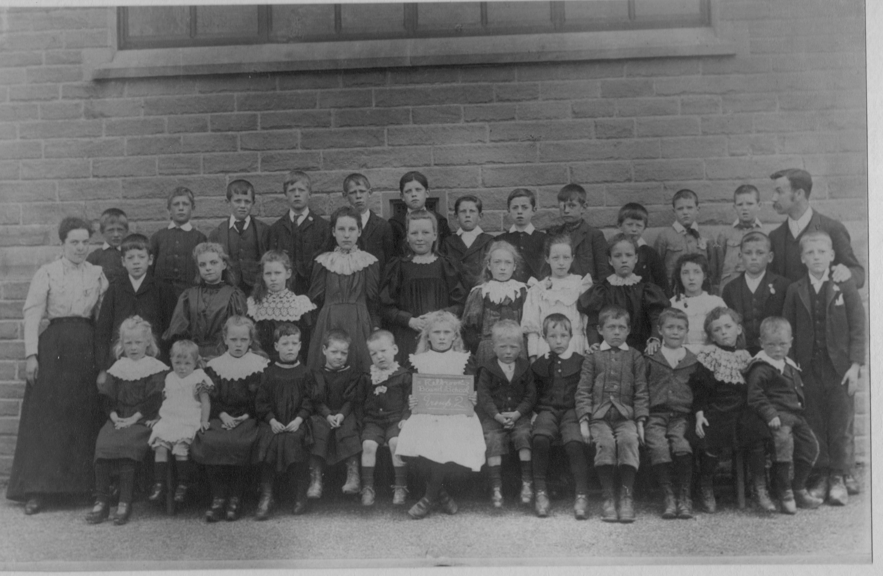 'Kelbrook Board School Group 2'. I can date this picture to 1897 from children I know about. My grandma Richards' four youngest siblings are in front of the male teacher and the three Exley children of Stone Trough are also identifiable. |