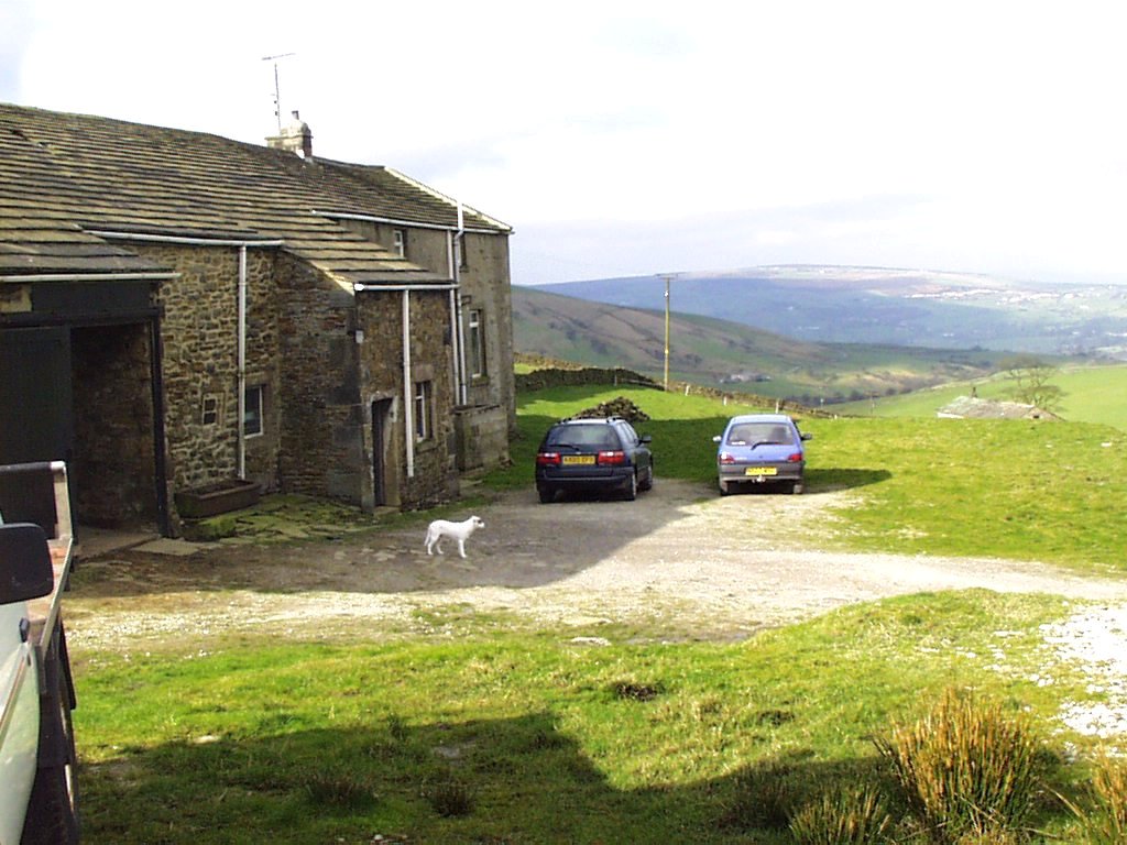 Taken about 2000, soon after we moved in, looking down Harden Clough towards Weets Hill. Alfie looking doubtful.