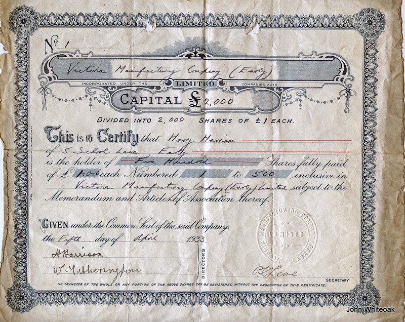 Certificate No.1 for 500 £1 shares issue in 1933 for Victoria Manufacturing Company (Earby) |