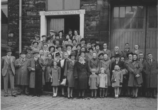 John Bradley-Manufacturer (2nd left, front row) and staff , before works outing to Chester. .......Granville Eastwood -head clothlooker (2nd left , 2nd row) |