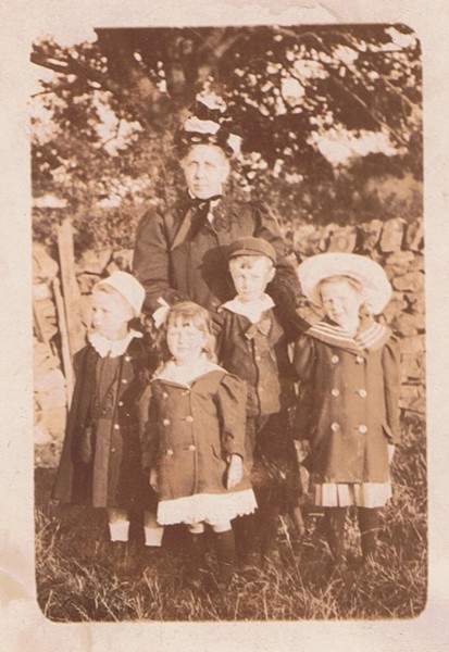 Elizabeth Bracewell with 4 of her grandchildren, l to r, Edith Ellen daughter of Edith Metcalf Bracewell. Mary Forrest, Billy Forrest and Hannah Forrest, all children of Canon William Bracewell who married Hannah Forrest, sister of Sir Willm Forrest |