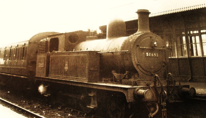 Puffing Billy steam loco waiting at Colne Railway Station on 26th September 1953 on the down platform. The loco's actual name was railmotor no.50653 with a its new 84000 class tank. As usual it is pulling two 1912 gas lit Hughes trailor cars.