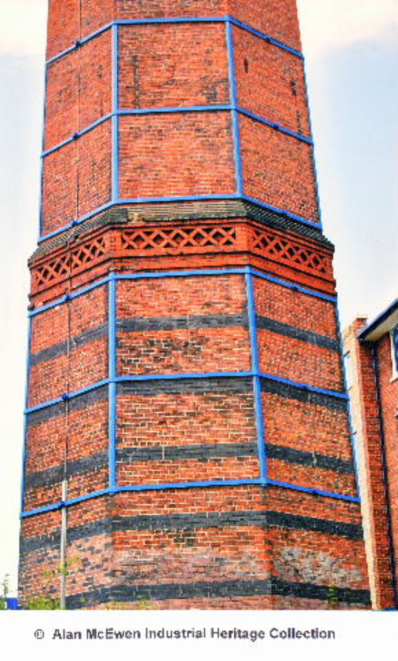 The stack has a beautiful coronet, probably made of cast iron. Junction Mill chimney is constructed of red brick with bands of Staffordshire blues, octagonal in shape; the overall height around 210 feet.