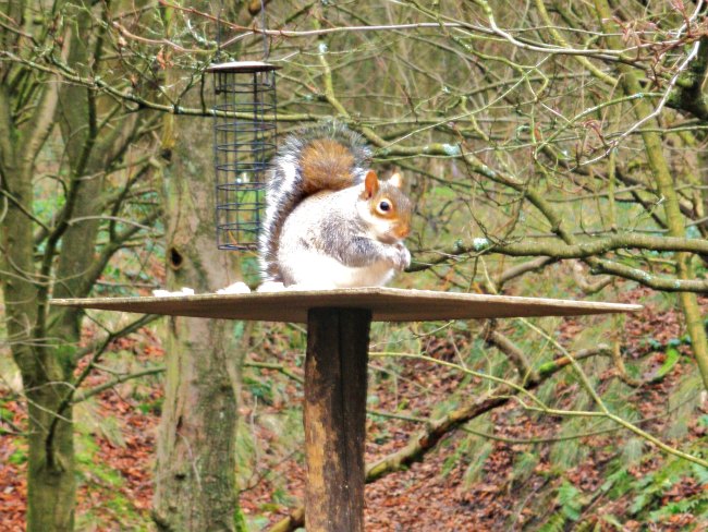 One of the many grey squirrels in Spring Woods near Whalley. They are often seen eating titbits from the feeding tables beside the carpark, while others climb the trees.