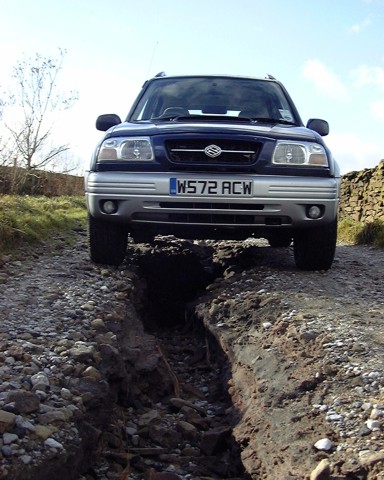 Pot Holes tend to get a bit bigger when it rains here - Listerwells Road (Occupation Lane) in Barnoldswick after a cloudburst during the summer 2002 |